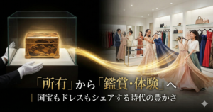 レンタルであれば、展覧会のテーマカラーに合わせた服を選んだり、季節ごとに違うコーディネートを楽しんだりと、ファッションの幅が大きく広がります。「所有」に縛られず、その時々のTPOに合わせて最適な装いを「選択」する。これこそが、現代におけるスマートで文化的な大人の嗜みです。次回の記事では、この「所有から利用へ」という価値観の転換がもたらす、新しい美の楽しみ方について詳しく掘り下げていきます。
